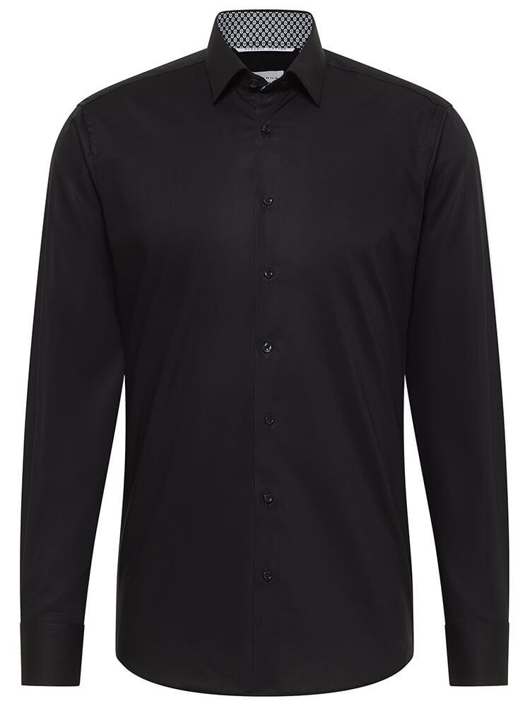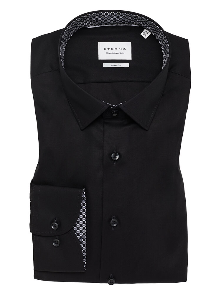 Das elegante Businesshemd aus der ETERNA Slim Fit Kollektion steht für den schlanken und modebewussten Mann von heute. Ein körperbetonter Schnitt verbunden mit modischen Produktdetails verspricht einen hohen Komfort und macht dieses Hemd zu einem Künstler der Kombination. Das unifarbene Herrenhemd in der Farbe schwarz darf in keiner Herrengarderobe fehlen und kann mit dem eleganten und klassischen Kent Kragen zu jedem Anlass sowie im Alltag getragen werden. Mit einer schmalen Krawatte und einem kleinen Krawattenknoten kommt dieses ETERNA Slim Fit Herrenhemd am besten zur Geltung.Herstellerinformation: