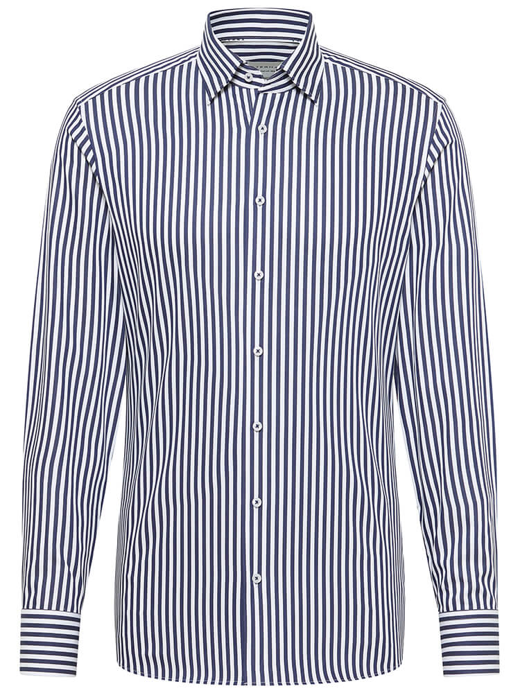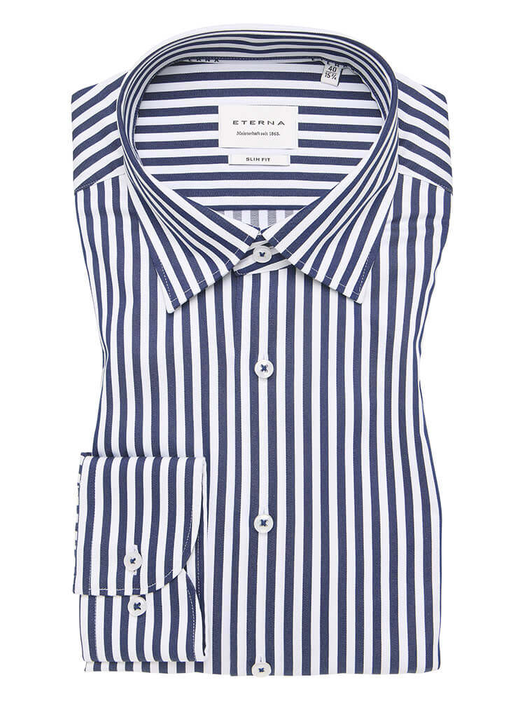 Das elegante Businesshemd aus der ETERNA Slim Fit Kollektion steht für den schlanken und modebewussten Mann von heute. Ein körperbetonter Schnitt verbunden mit modischen Produktdetails verspricht einen hohen Komfort und macht dieses Hemd zu einem Künstler der Kombination. Das gestreifte Herrenhemd in der Farbe dunkelblau darf in keiner Herrengarderobe fehlen und kann mit dem eleganten und klassischen Under-Button-down Kragen zu jedem Anlass sowie im Alltag getragen werden. Mit einer schmalen Krawatte und einem kleinen Krawattenknoten kommt dieses ETERNA Slim Fit Herrenhemd am besten zur Geltung.