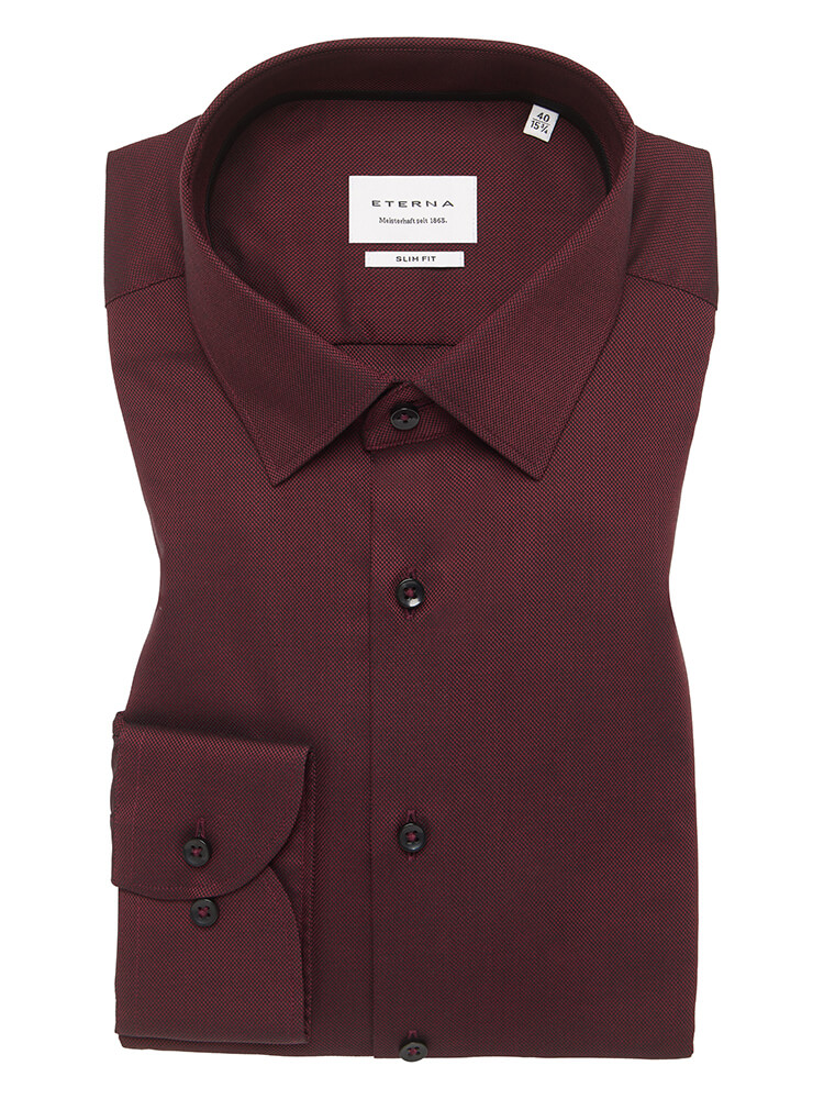 Das elegante Businesshemd aus der ETERNA Slim Fit Kollektion steht für den schlanken und modebewussten Mann von heute. Ein körperbetonter Schnitt verbunden mit modischen Produktdetails verspricht einen hohen Komfort und macht dieses Hemd zu einem Künstler der Kombination. Das unifarbene Herrenhemd in der Farbe dunkelrot darf in keiner Herrengarderobe fehlen und kann mit dem eleganten und klassischen Kent Kragen zu jedem Anlass sowie im Alltag getragen werden. Mit einer schmalen Krawatte und einem kleinen Krawattenknoten kommt dieses ETERNA Slim Fit Herrenhemd am besten zur Geltung.Herstellerinformation: