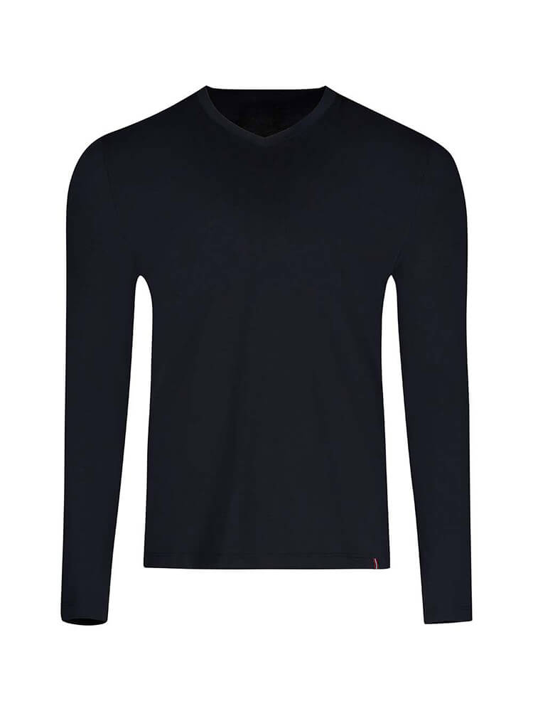 Der V-Ausschnitt und die langen Ärmel verleihen dem Shirt eine moderne, zeitlose Optik. Dank Regular Fit, bügelleichter Qualität und maschinenwaschbarer Pflegeeigenschaften ist es ideal für den Alltag und unkompliziert in der Handhabung.