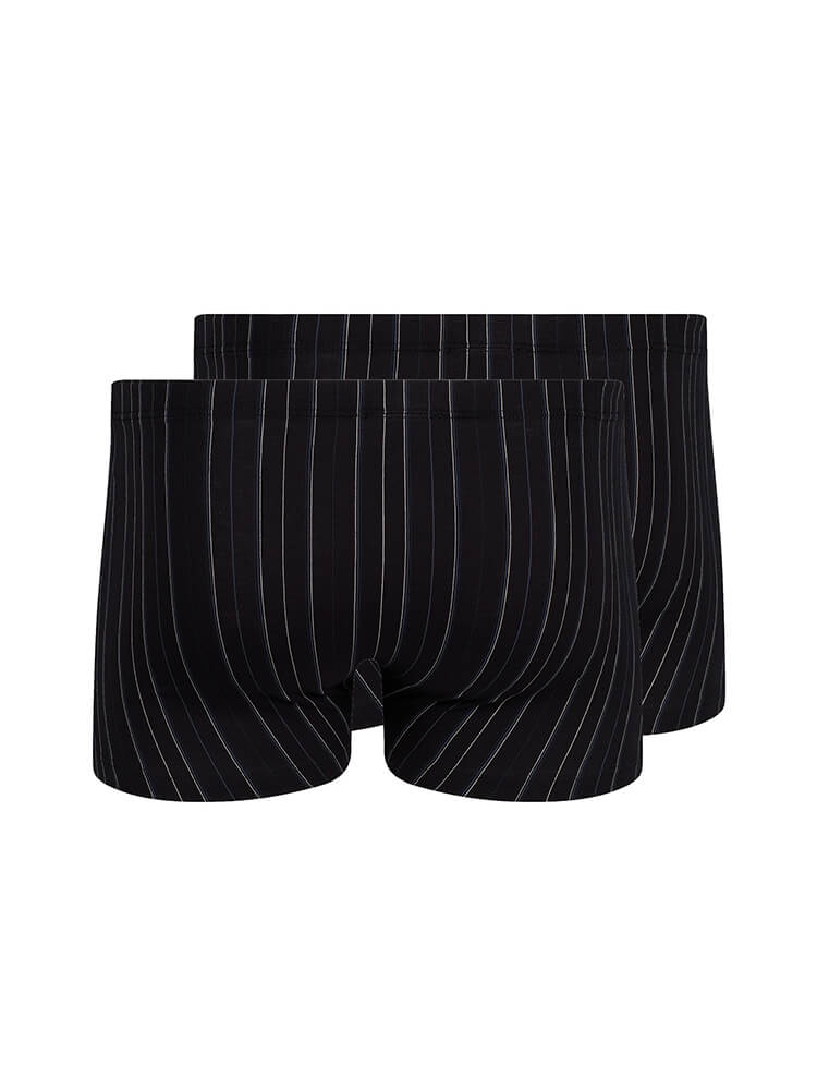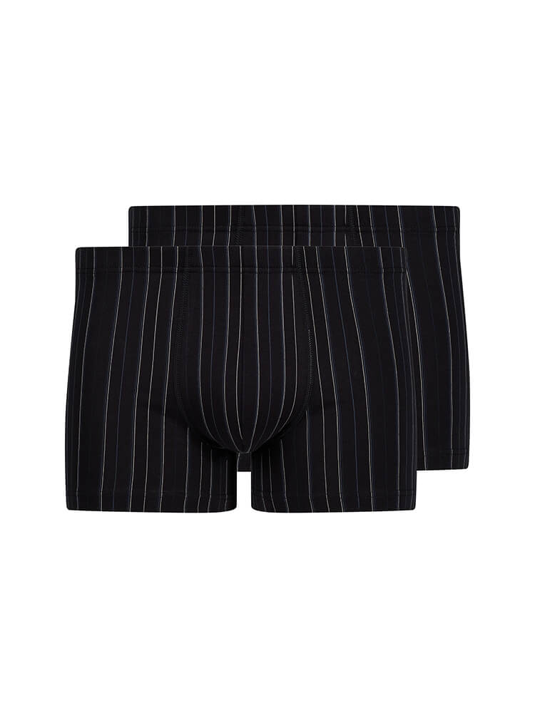 Die HUBER hautnah Cotton 2 Pack Shorts in Schwarz mit dezenten Streifen bieten ein weiches, anschmiegsames Tragegefühl. Der Jersey aus 95% Baumwolle und 5% Elasthan sorgt für elastischen, atmungsaktiven Komfort.