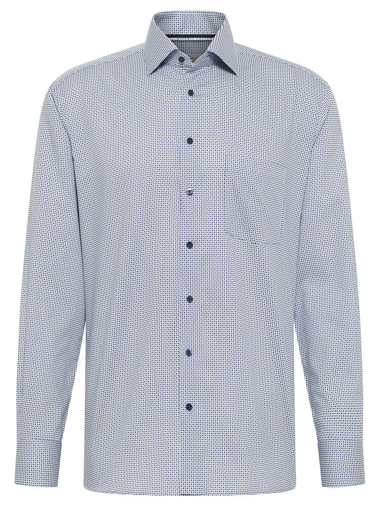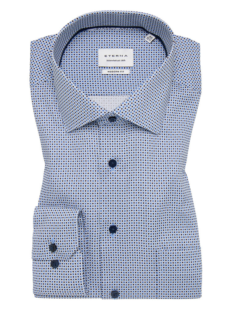 Das moderne Businesshemd aus der ETERNA Modern Fit Kollektion steht für den selbstbewussten und modischen Mann von heute. Ein zeitgemäßer Schnitt verbunden mit erstklassigen Produktdetails verspricht einen hohen Komfort und macht dieses Hemd zu einem Meister des Arrangements. Das gemusterte Herrenhemd in der Farbe hellblau darf in keiner Herrengarderobe fehlen und kann mit dem vornehmen und klassischen Kent Kragen zu jedem Anlass sowie im Alltag getragen werden. Mit einer passenden Krawatte und einem großen Krawattenknoten kommt dieses ETERNA Modern Fit Herrenhemd am besten zur Geltung.