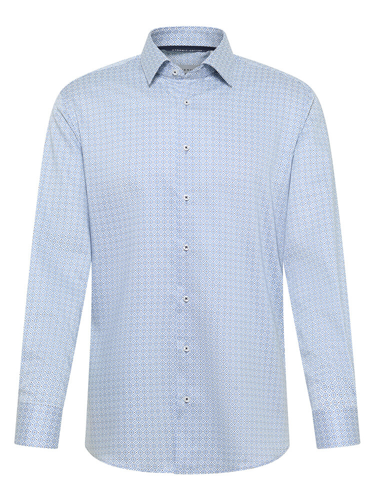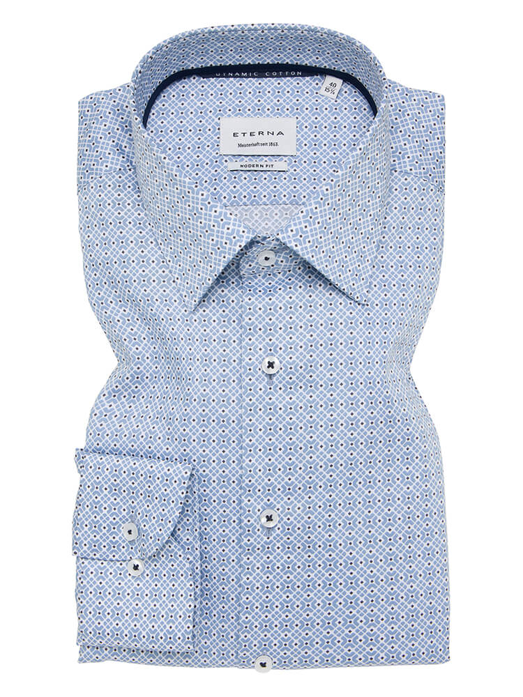 Das moderne Businesshemd aus der ETERNA Modern Fit Kollektion steht für den selbstbewussten und modischen Mann von heute. Ein zeitgemäßer Schnitt verbunden mit erstklassigen Produktdetails verspricht einen hohen Komfort und macht dieses Hemd zu einem Meister des Arrangements. Das gemusterte Herrenhemd in der Farbe hellblau darf in keiner Herrengarderobe fehlen und kann mit dem vornehmen und klassischen Kent Kragen zu jedem Anlass sowie im Alltag getragen werden. Mit einer passenden Krawatte und einem großen Krawattenknoten kommt dieses ETERNA Modern Fit Herrenhemd am besten zur Geltung.