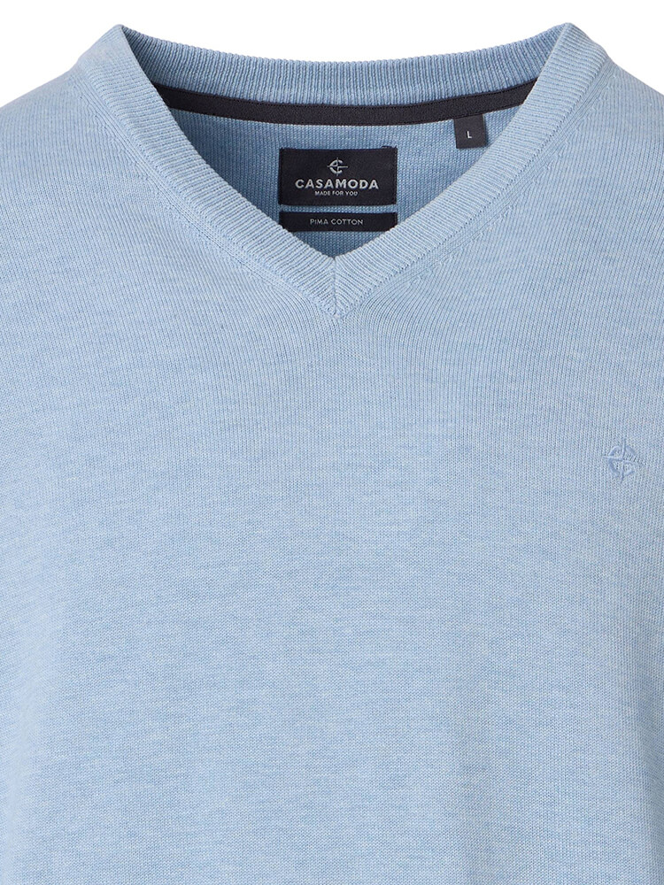 Zu jeder Jahreszeit, sorgt der überaus stilvolle CASAMODA regular fit Strickpullover an kühleren Abenden oder Tagen für ein angenehmen Tragekomfort. Dieser unifarbene Strickpullover in der Farbe hellblau aus 100% Baumwolle mit eleganten V-Auschnitt ergänzt Ihren Kleiderschrank und unterstreicht ihre maskuline Silhouette. Ob in der Freizeit oder im Büro der Wohlfühlfaktor ist mit diesem leicht taillierten Pullover aus dem Hause CASAMODA garantiert.